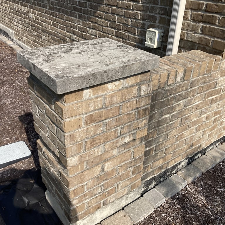 Black algae and surface grime removed from brick wall and concrete cap - Orland Park