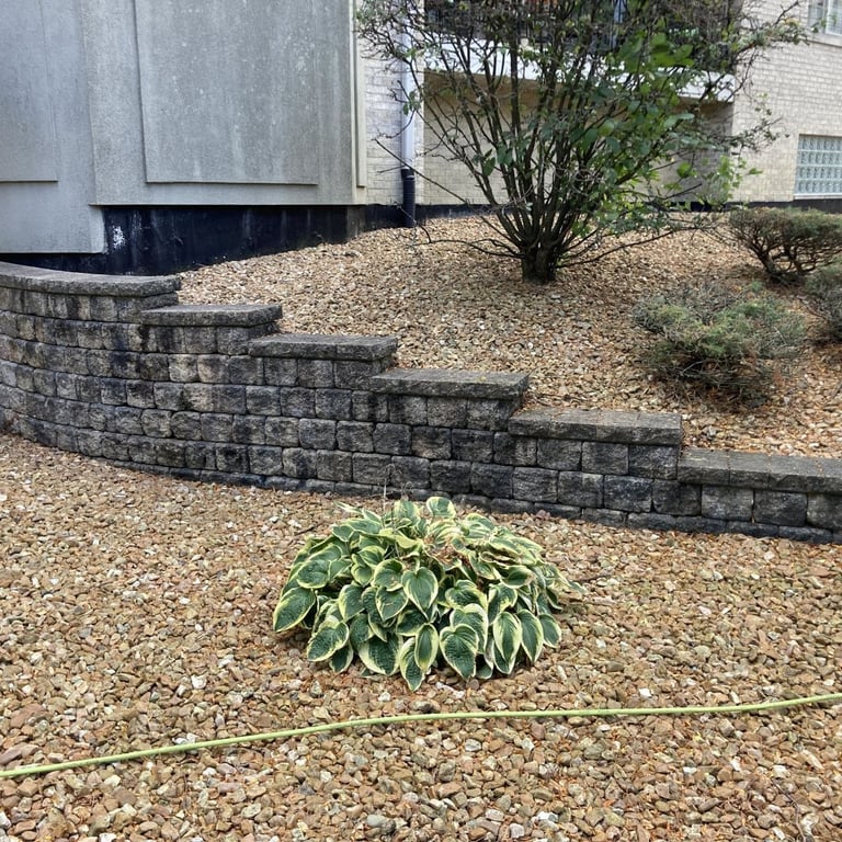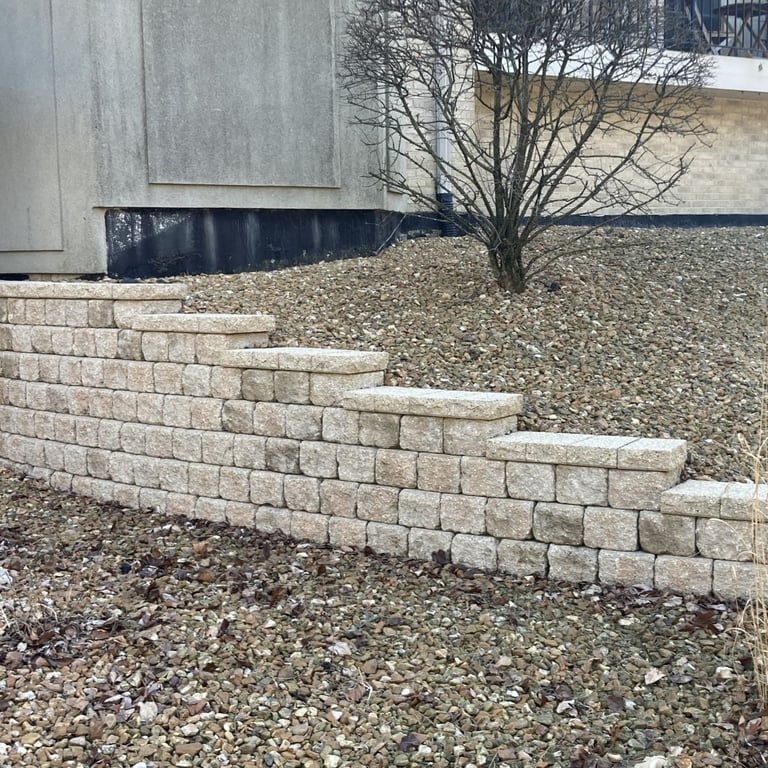 Retaining wall cleaning removing 20 years of algae, dirt, and organic staining – Orland Park.